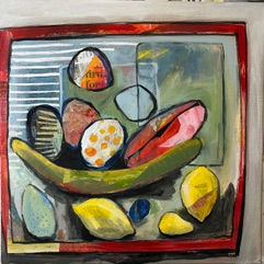 Colourful and inventive still life paintings - realistic and sem-i-abstract - by Carole Condé and Sara Huxley